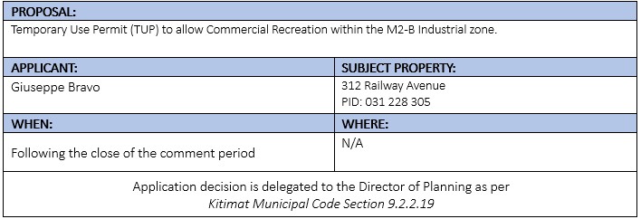 Pursuant to Sections 9.2.2.17 and 9.2.2.19 of the Kitimat Municipal Code, when an application for a TUP is submitted, the Director of Community Planning & Development may issue the permit upon receipt of all required fees, supporting documentation, completion of the public review process, and consideration of staff recommendations. Council will be notified of any staff decisions and will retain its role as the appeal body. Public comments will be considered as part of the decision-making process and will be accepted until Thursday, March 5, 2026.